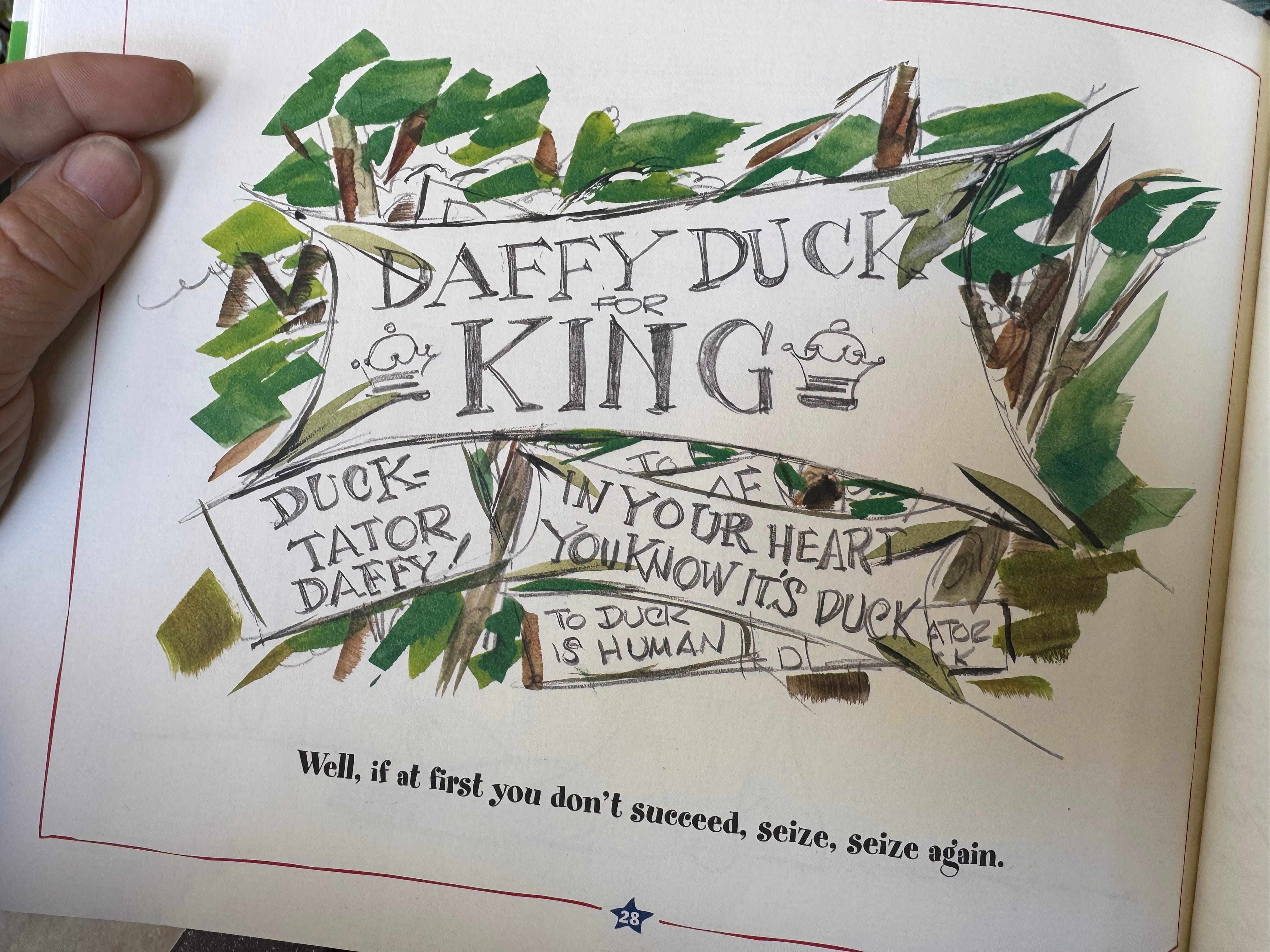 Story ends with Daffy deciding to run for king. To quote “Duck-tator Daffy”, “Well, if you don’t succeed, seize, seize again!”