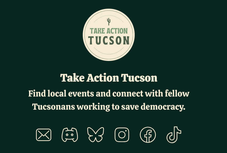 “I'm writing as an advocate for people who are not yet on the streets protesting because they don't know where to look for info on Tucson events to save our democracy. Please be sure people know to check the website takeactiontucson.org (TAT). This website publishes a calendar, updated weekly of all resistance events, times, locations, and organizers taking place in Tucson.”