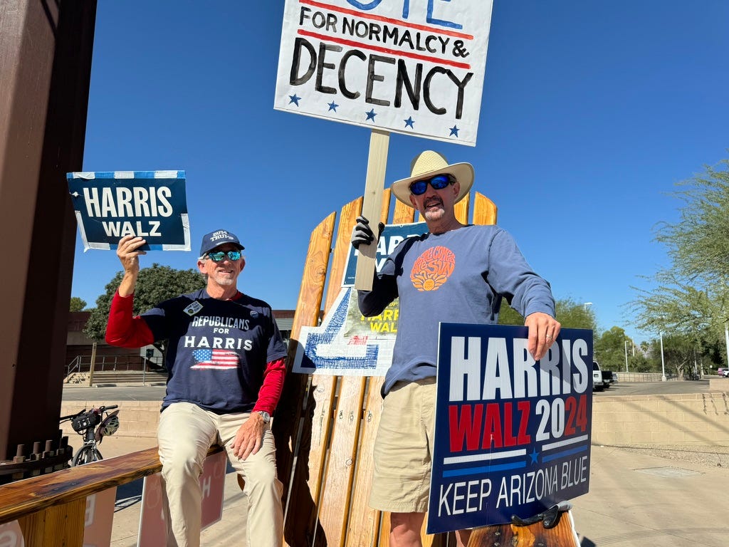 …because I went to the intersection of Speedway and Wilmot and met an earnest Dem who was David Letterman’s publicist. She went to Speedway and Wilmot, too, and we wondered where everyone was and we figured waiting in line to see Walz or canvassing so we waved signs and got honks and thumbs ups and then my phone rang.