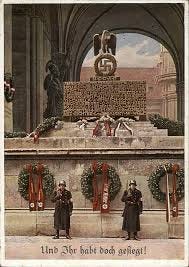 According to scholars, “After the Nazis rose to power, a monument was erected at the Feldherrnhalle in Odeonsplatz to commemorate the 16 Nazis killed during the 1923 coup attempt known as the Beer Hall Putsch.” Hitler made heroes of his failed street thug insurrectionists, turning the dead into “martyrs”, propaganda tools, posting an SS guard at the site and demanding citizens give the Nazi salute to his dead anti-Semitic treasonous pets.