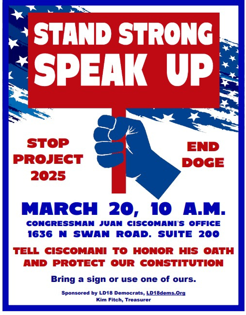 In a previous post I got the day and dates for the Ciscomani action wrong. I apologize. The protest is slated for March 20th at 10AM which is on a Thursday, next week.
