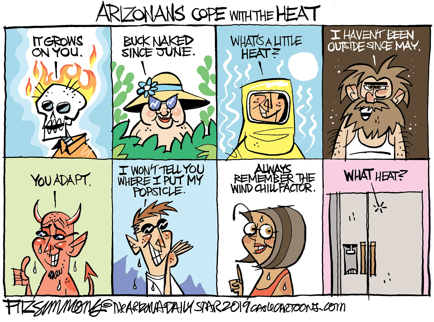 Here in Tucson, for ONE time period of the calendar year, we endure the heat and thank the gods that we're not in Phoenix ... "up there" on the map, "down there" in elevation. We do so !n order to enjoy the best weather on the planet for the other months! I grew up in NJ humidity, lived with impossible snow in NYS, and escaped to Tucson in 1971. While I may be a "Semi-Native," I'm a die-hard booster of our high desert, 'The Old Pueblo,' and Indian fry bread! Get a grip, people ... October will happen again!